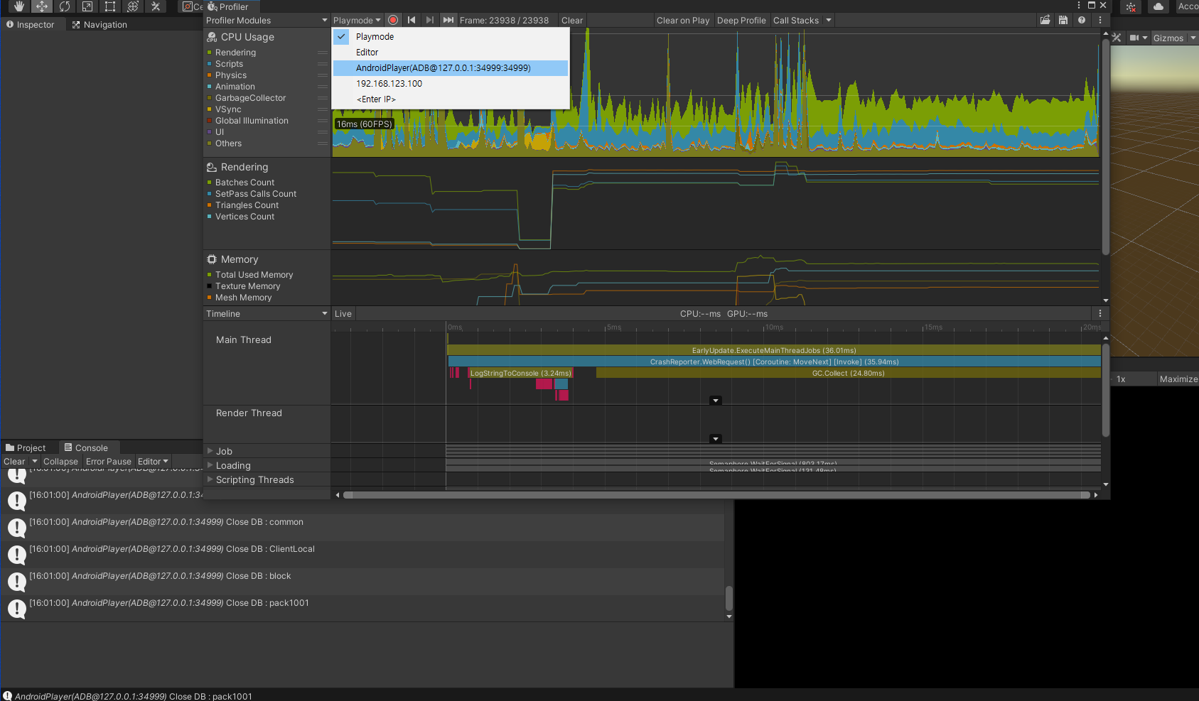 4. Unity를 실행후 Profiler를 열어 아래사진처럼 AndroidPlayer(ADB@127.0.0.1:34999)를 선택,