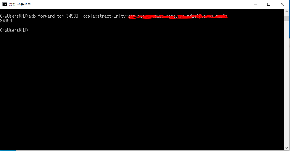 3. Command창을 열어 adb foward tcp:34999 localabstract:Unity-com.your.packageName