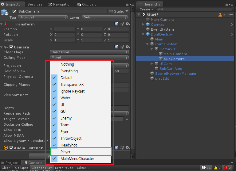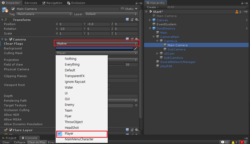 - 메인 카메라에 플레이어만 Culling mask 지정
