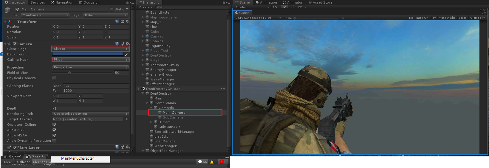 -메인카메라로 확인하시면 플레이어만 보이는것을 확인할수 잇다.