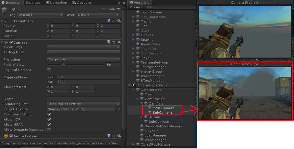 이런 이유로 두대로 CullingMask를 사용하여 플레이어는 흔들리것이 보이지 않게 연출 한것이다.