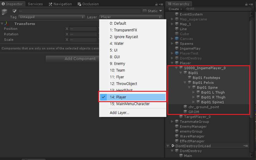 - 플레이어 오브젝트에 레이어 지정 (플레이어 의 하부 오브젝트까지 지정해줍니다 )
