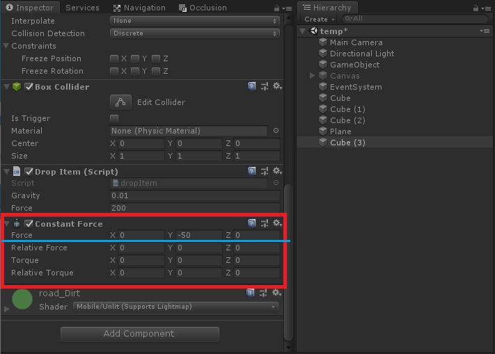 1. 해당 오브젝트에 Constant Force 컴포넌트를 추가 하고 Force 벡터 값에 원하는 중력값을 넣습니다.